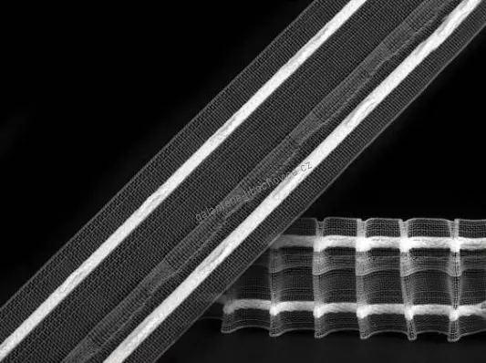 100% polyester.Pravidelně řasící transparentní záclonová stuha o šíři 25 mm. Po našití a nařasení připevníte záclonu nebo závěs pomocí žabek nebo háčků s využitím řady kapsiček vetkaných do stuhy. Vzdálenost skladů cca 1,5 cm